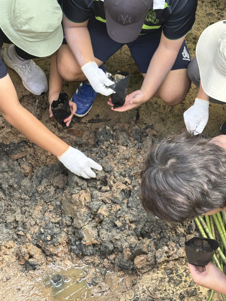 The process was simple but very impactful. We filled a black plastic bag with holes with wet mud and carefully placed a mangrove propagule deeply lodged inside it, ensuring it was firmly rooted to begin its growth journey.